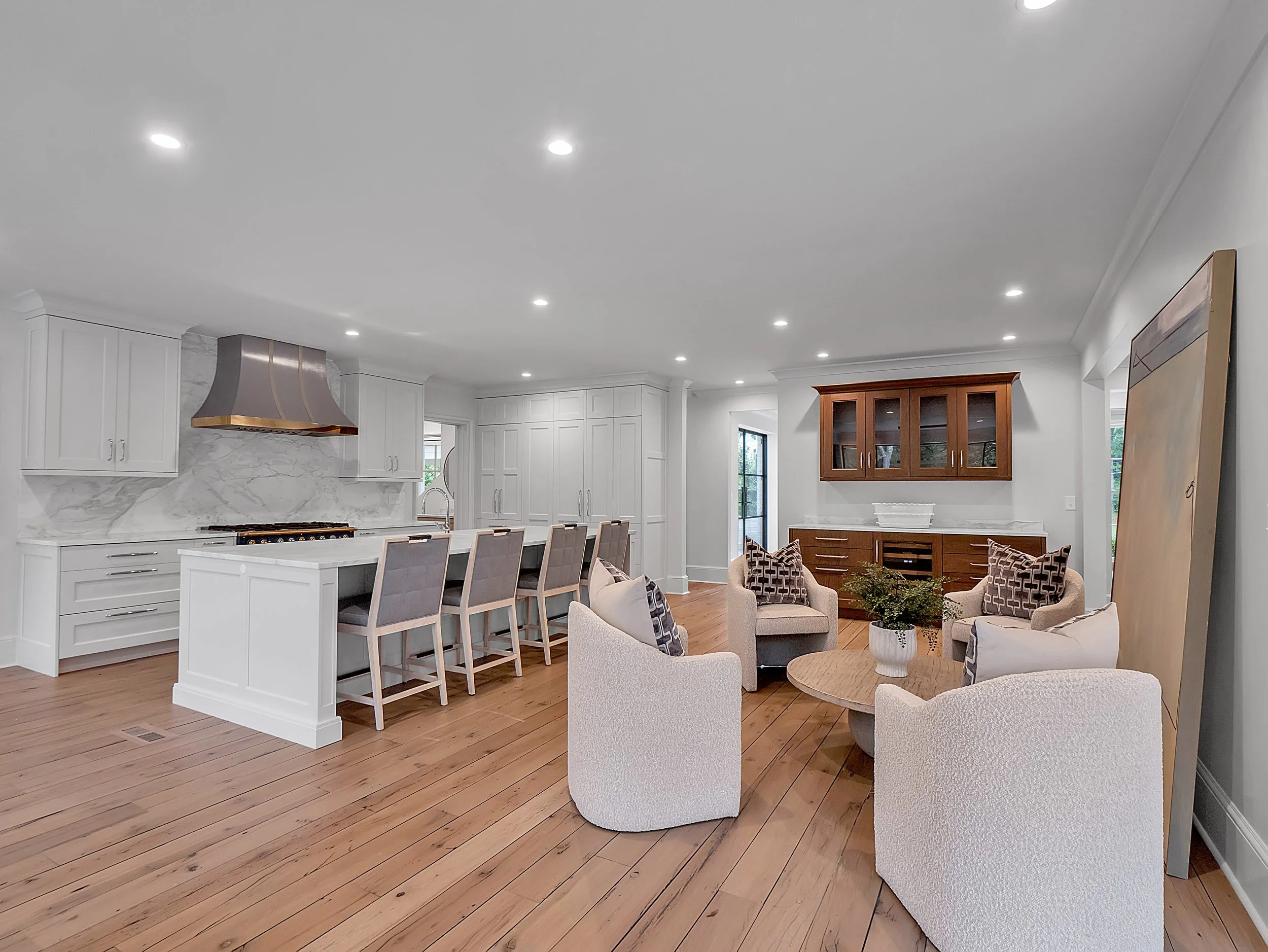 Every detail of 3625 Tuxedo Road showcases a masterful renovation — from the restored original front door with replated knobs to the dramatic new steel windows and doors that flood the interiors with natural light. Walls were removed to reveal the graceful curve of the foyer staircase, now a focal point beneath a striking leaded-glass skylight.